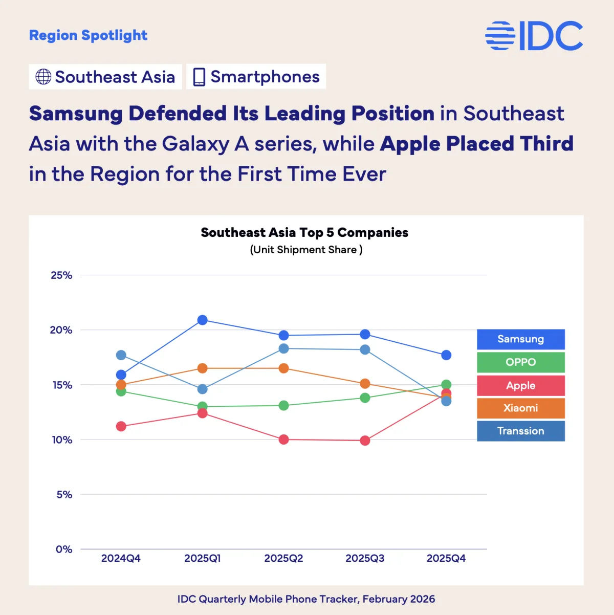 Samsung retained the top position in Southeast Asia, helped by demand for its Galaxy A-series devices. Apple rose to third place in the region for the first time, reflecting stronger sales in higher-income markets.